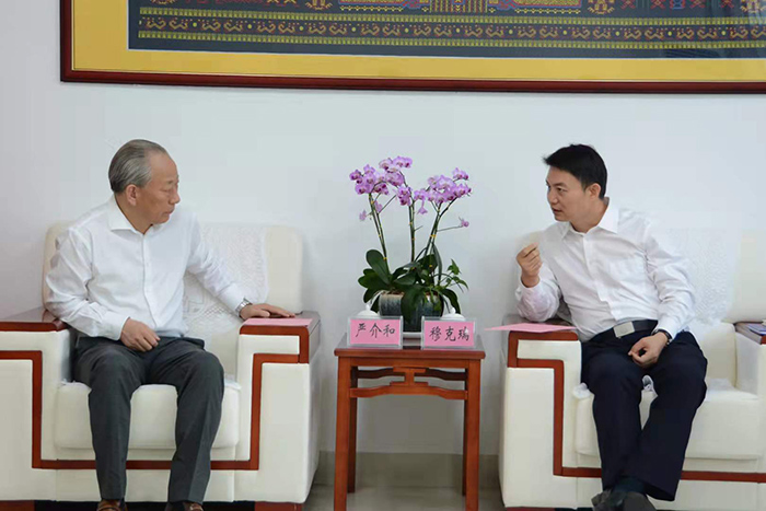 11月1日,严介和理事长应邀同海南省保亭县委书记穆克瑞会谈,双方就开展地企合作等问题进行了交流。庄严建设董事局主席金亮、地球村建设董事局主席胡童全程陪同。