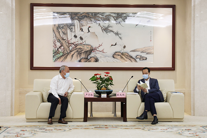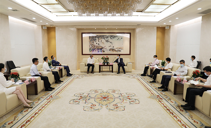5月10日上午,严介和理事长应邀同广东省东莞市委副书记、市长呂成蹊在莞会谈。双方就东莞城市基础设施投资、建设、运营与管理展开交流。庄严文旅董事局主席陈志成、沪商建设董事局主席仉晓龙参加会谈。